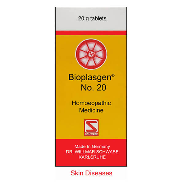 Bioplasgen 20 : Traditionally used as supportive treatment in skin disease. Scurfy eruptions on the scalp and faces of children; eczemas due to uterine disorders, acne, pemphigus, herpes, erysipelas, crusta lactea (cradle cap) and similar eruptive diseases.